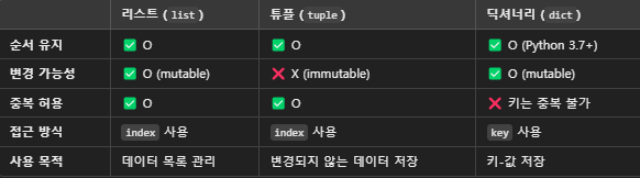 리스트(list), 튜플(tuple), 딕셔너리(dict)는 각각의 특징이 있으며, 상황에 따라 적절하게 선택해서 사용하는것이 좋다.